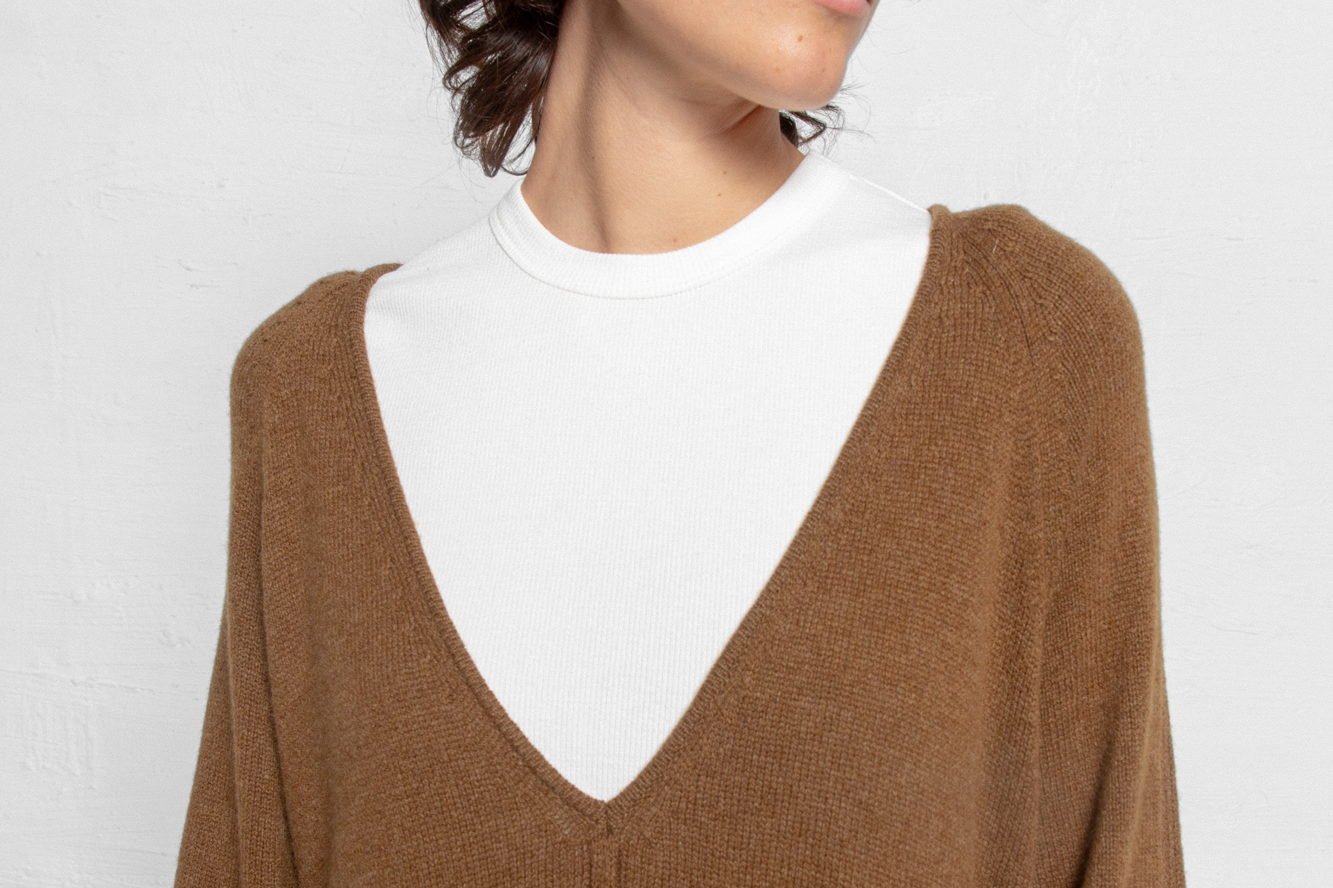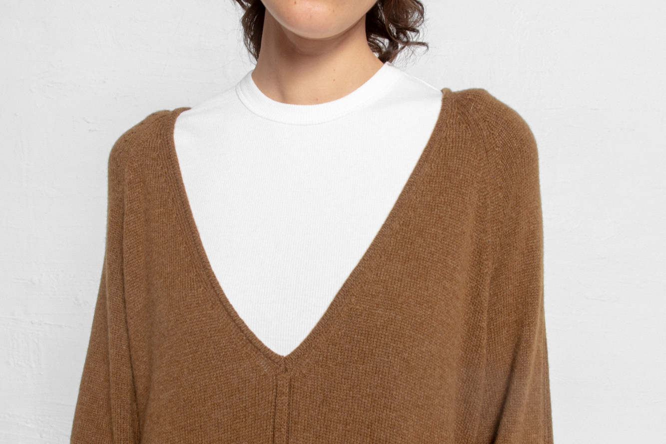Our warm, light weighted tunic knit is made from a luxurious blend of Cashmere and Virgin Wool. With a draped fit and deep v-neck it is elegantly paired with tailored pants or jeans.