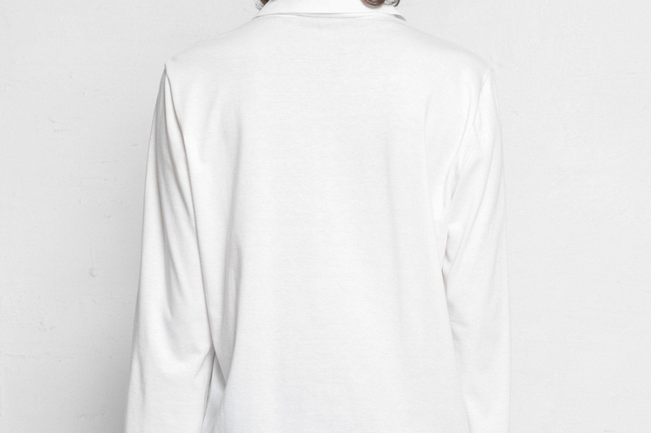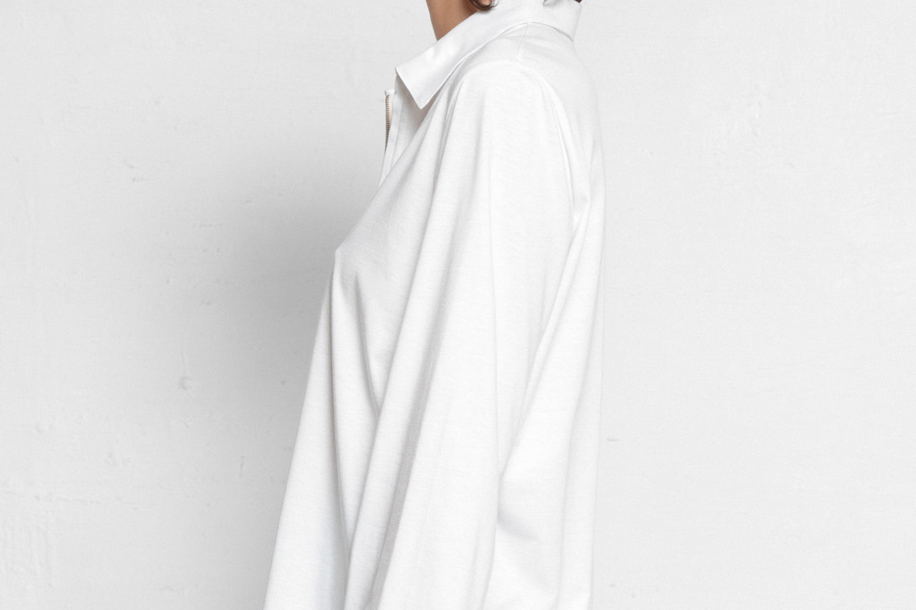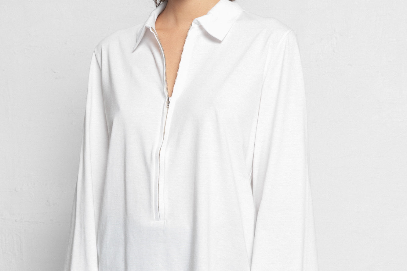 Alma, 70s inspired Zipper Long sleeve T-shirt. Made in 100% Organic Cotton GOTS certified. Fitted silhouette with a v-neck with polo collar. Wide, open sleeves.
