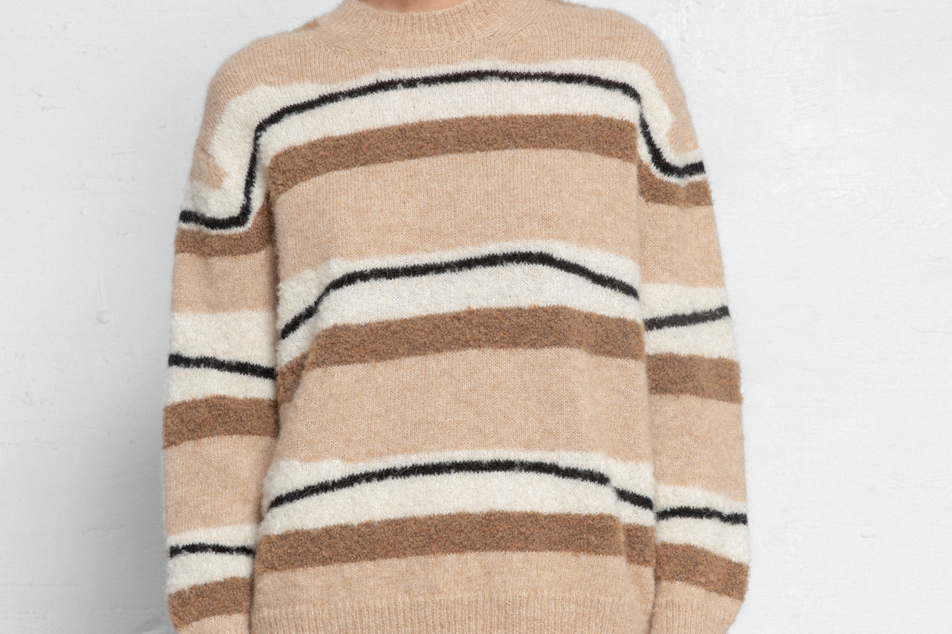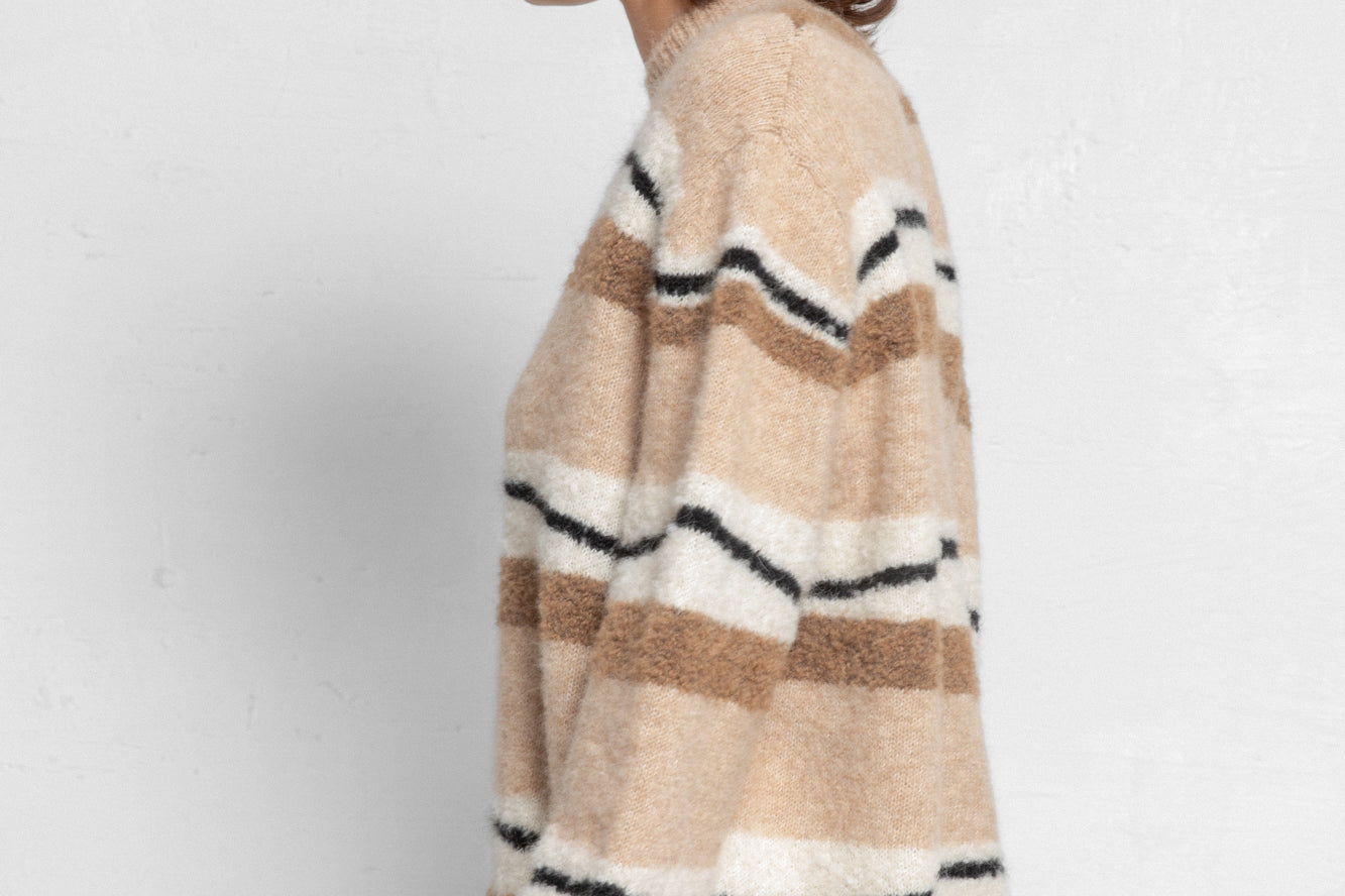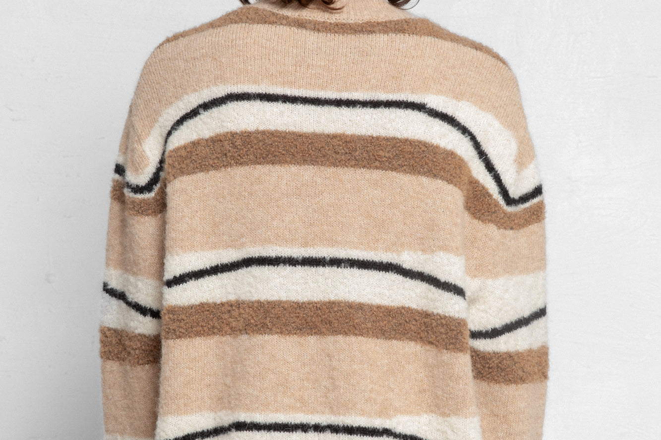 Irregularly striped large pullover in an Alpaca knit. It's spun from sumptuously soft, lightweight Alpaca with a cable-knit texture, finished with dropped shoulders and wide cuffs.