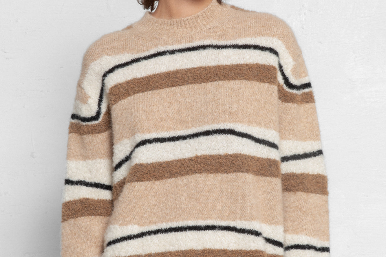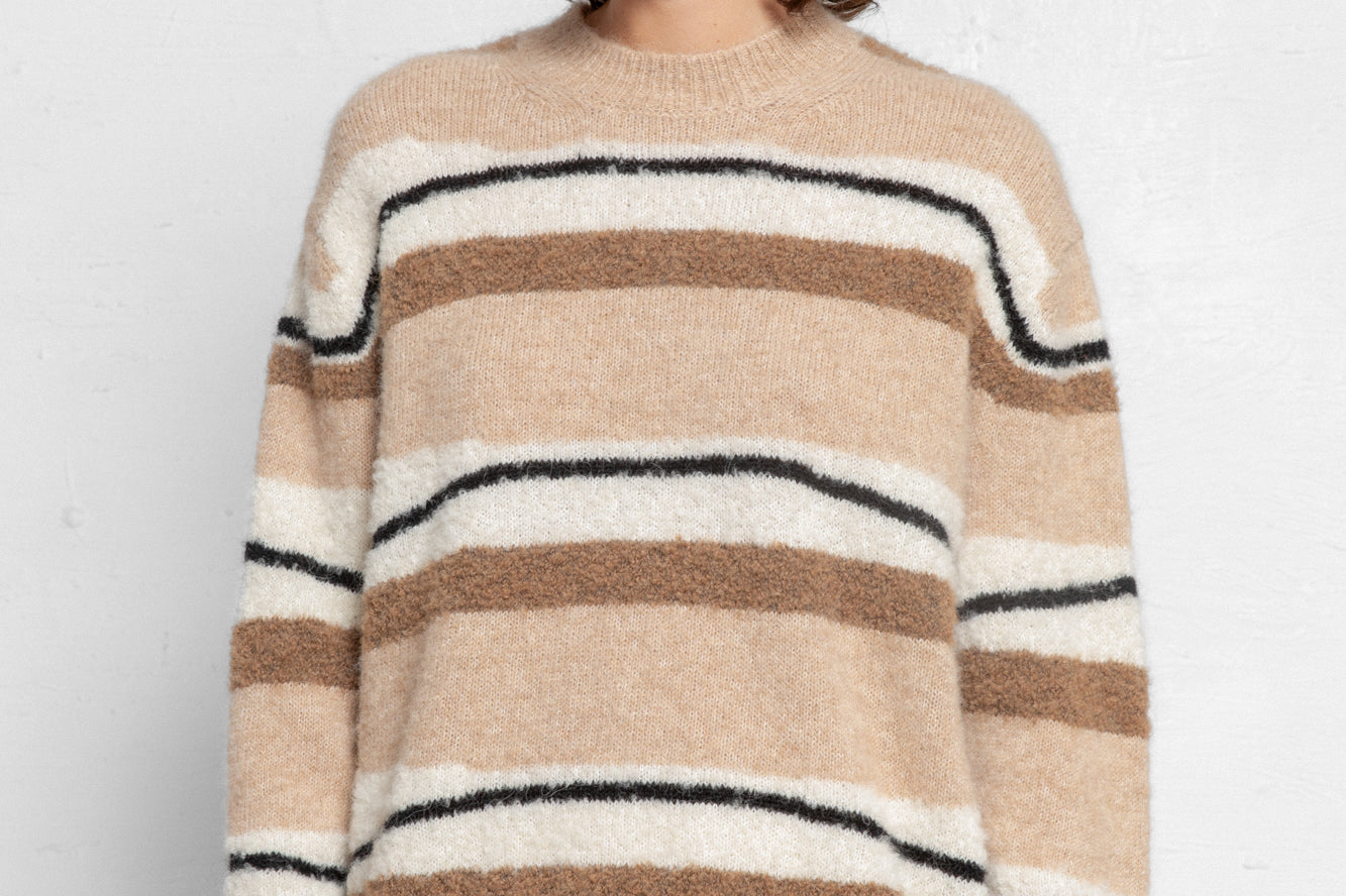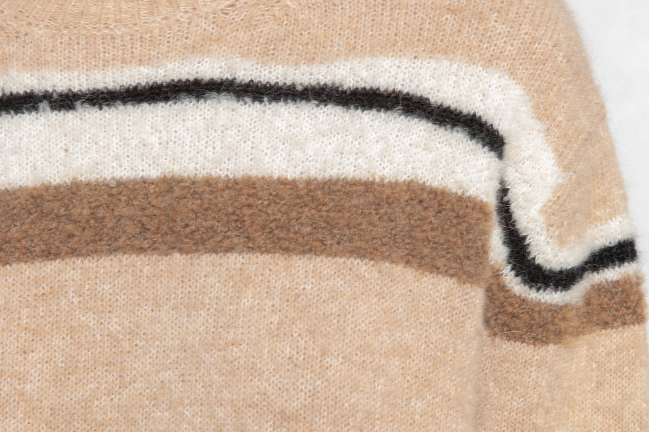 Irregularly striped large pullover in an Alpaca knit. It's spun from sumptuously soft, lightweight Alpaca with a cable-knit texture, finished with dropped shoulders and wide cuffs.