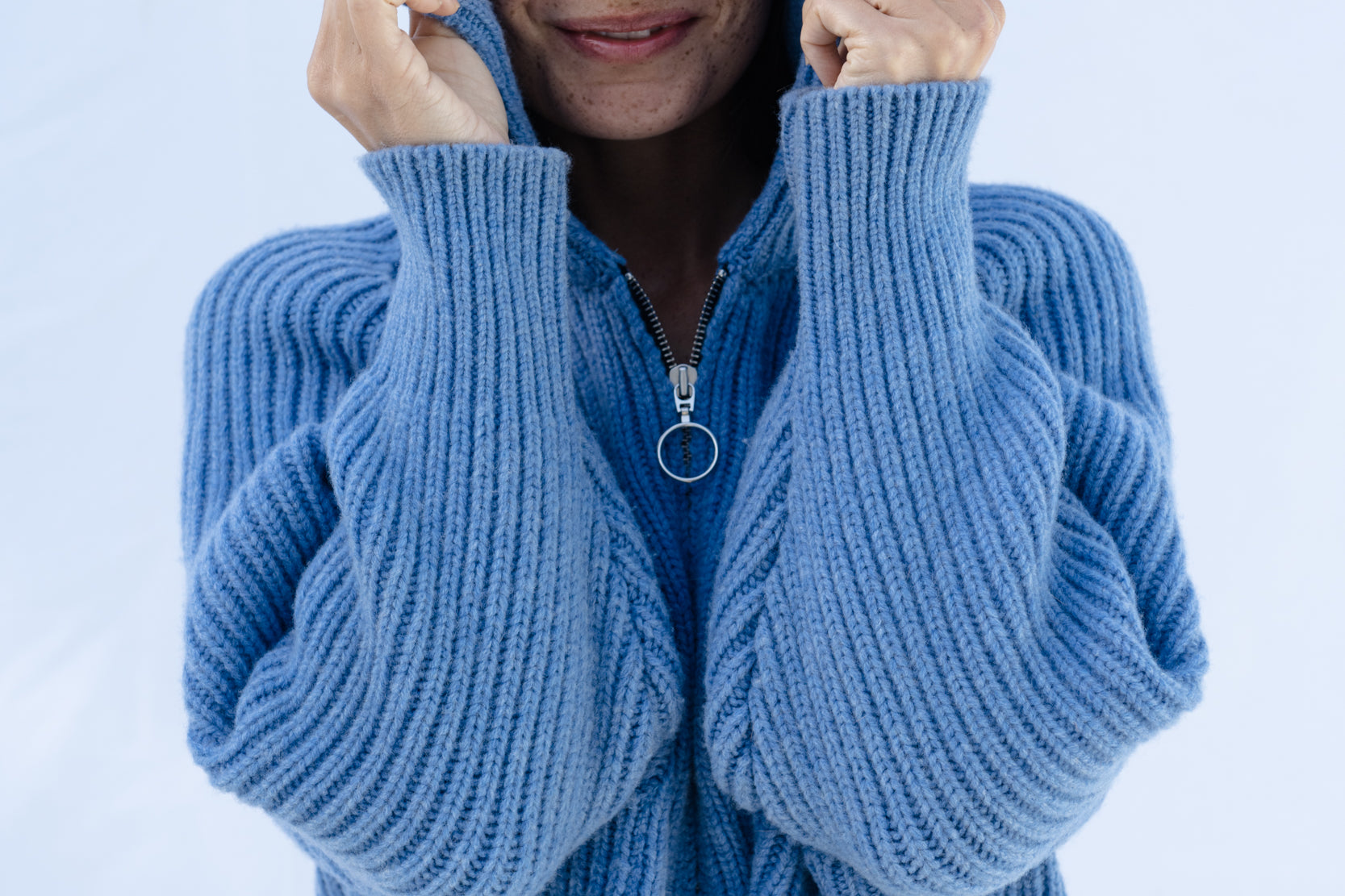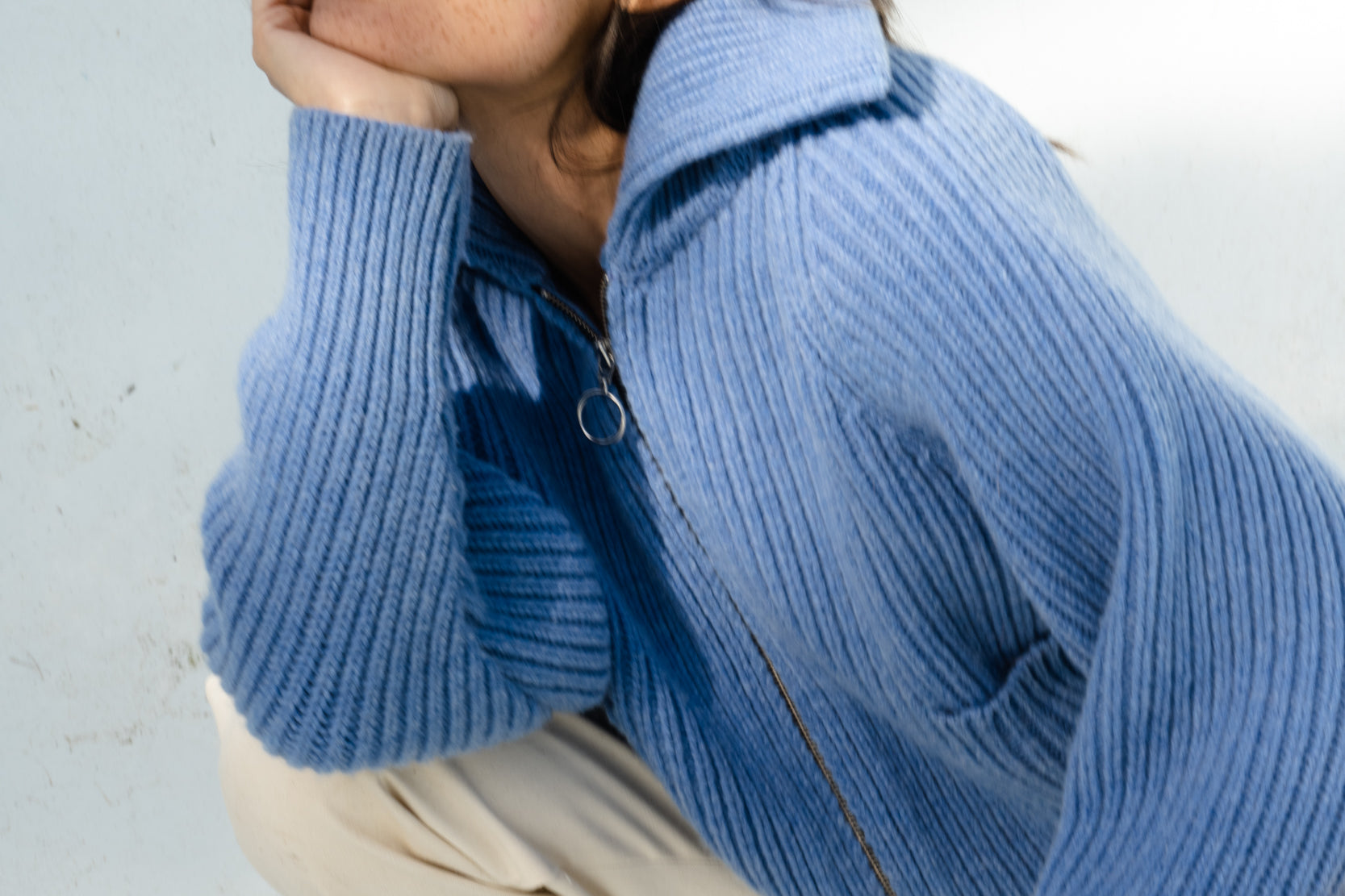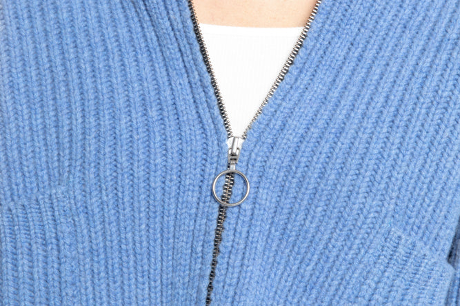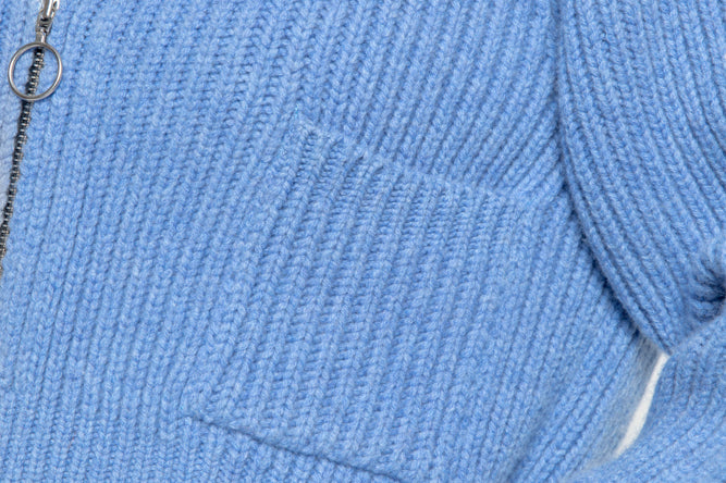 Lilly Polo Cardigan a boxy, relaxed fit cardigan. Made in a premium, soft 100% Virgin Wool yarn. Polo neckline and ribbed collar. Front YKK zipper, ribbed trimmings, and front patch pockets. Cozy, warming layer with the natural temperature regulation of Wool.