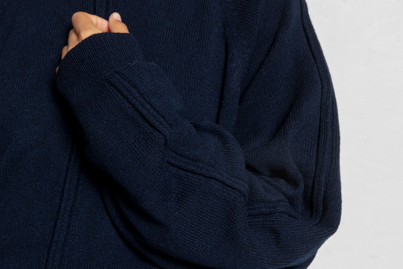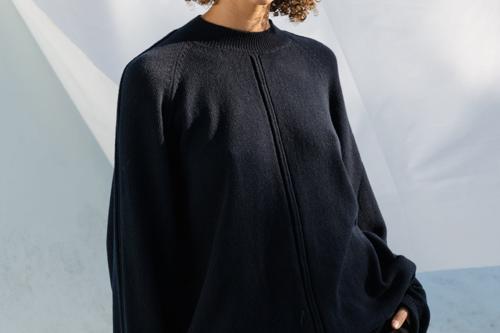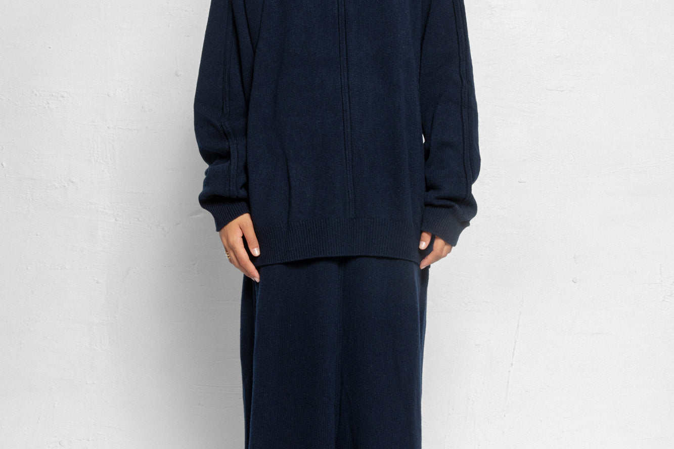 The Serge Pullover is a unisex fit. Lightweight, warming knit made from a Cashmere and Virgin Wool yarn. Raglan sleeves, ribbed trims and a front seam detail and high neckline. Luxurious, comfortable knitwear to keep you cozy over the colder months.