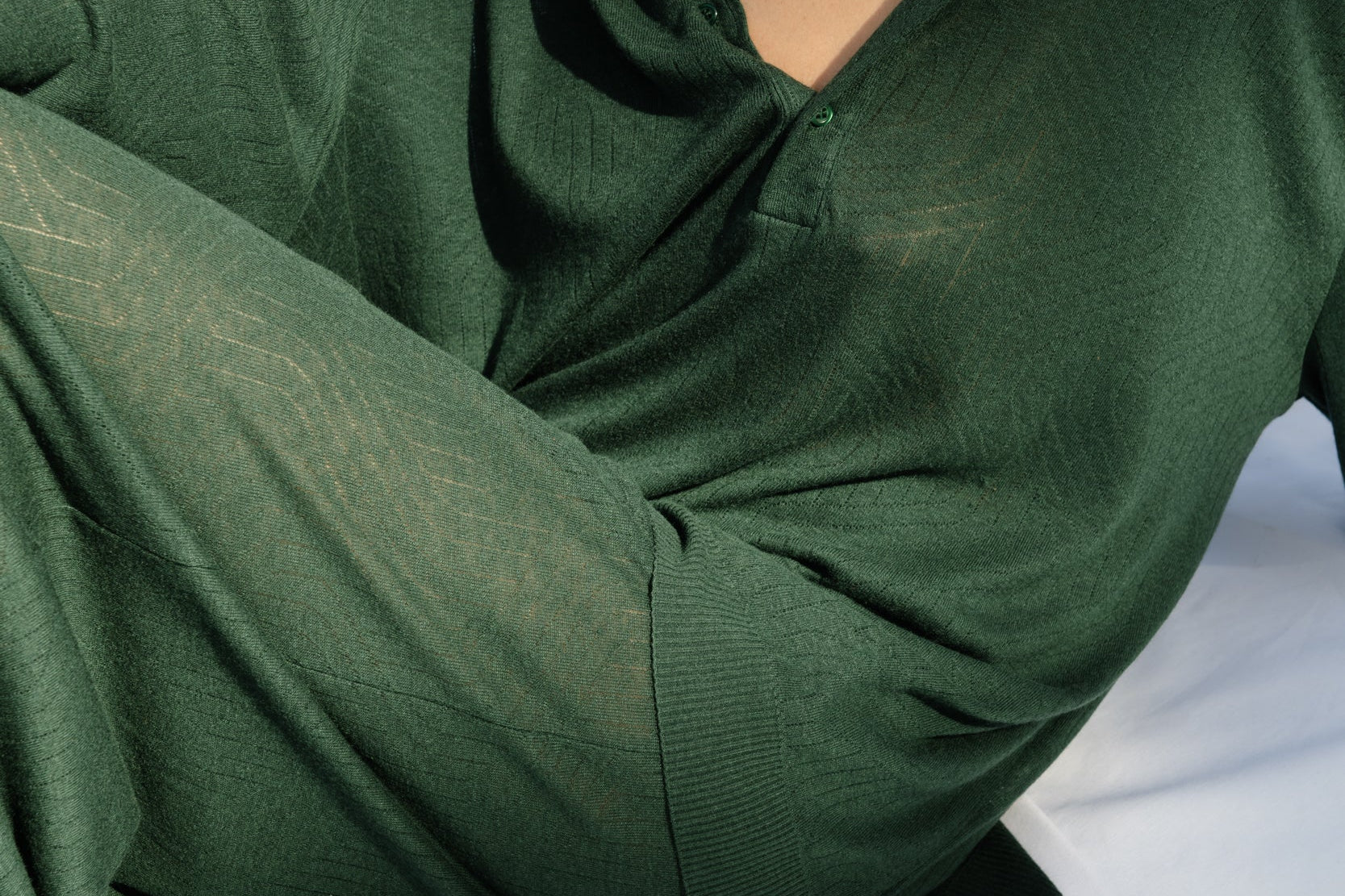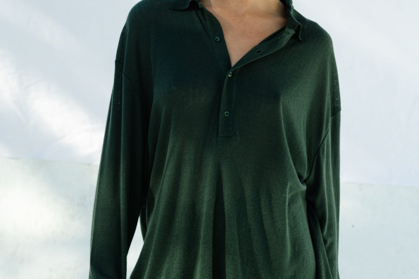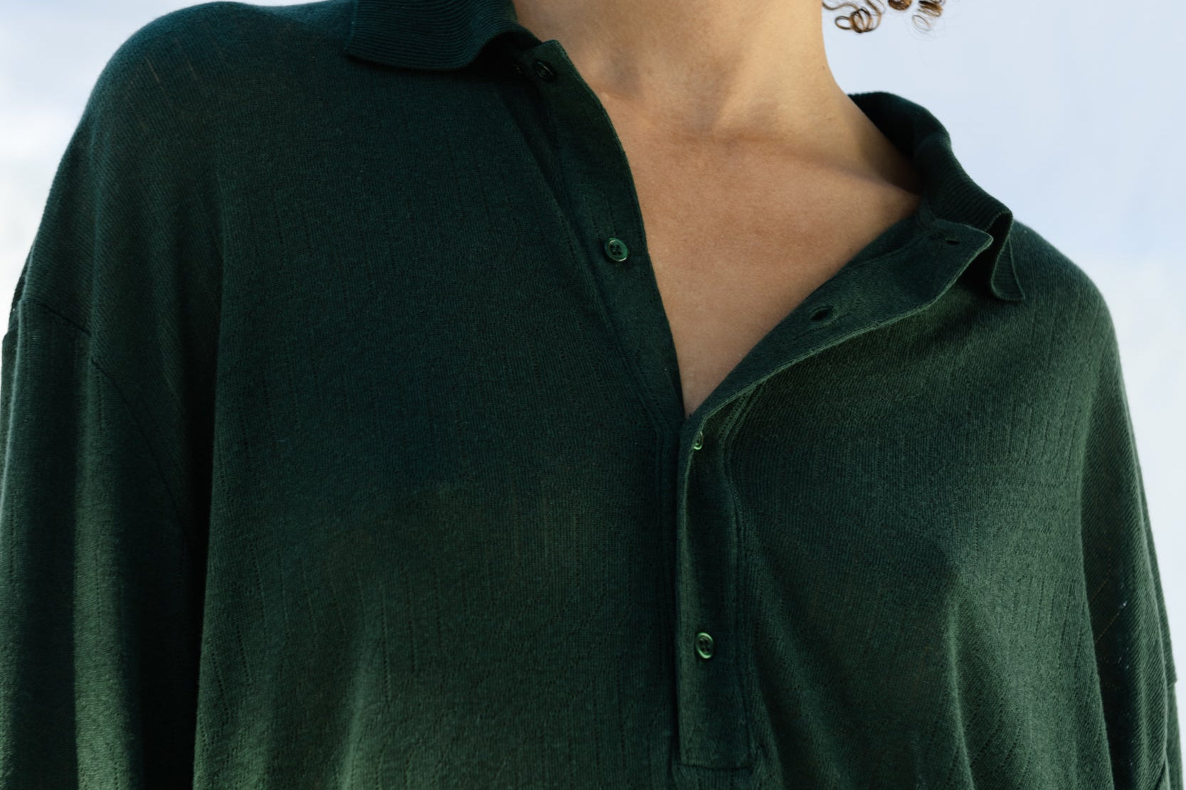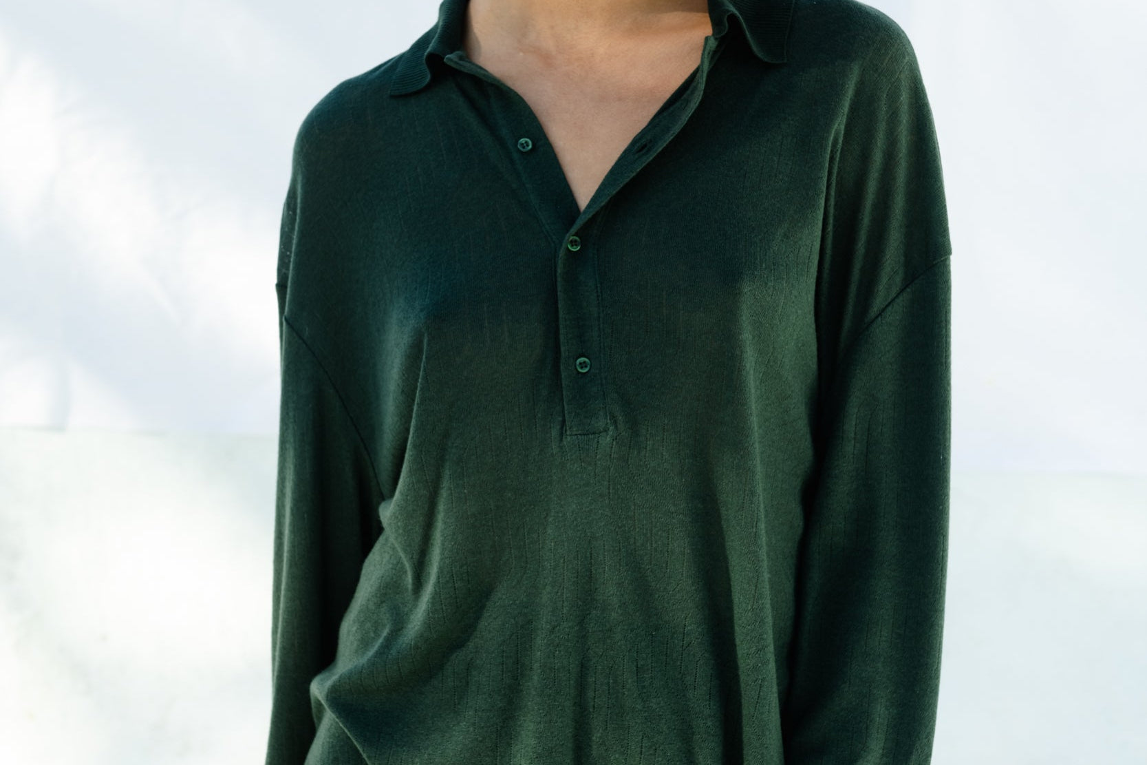 Unisex Polo Damon made from a light, warming Lyocell Wool blend. Unisex, relaxed fit. Dropped shoulders and a ribbed finish on the neckline and cuffs. Polo neckline and Mother of Pearl button closure OEKO-TEX certified. Elevated, comfortable design. Needle-out garment detail inspired by 70s textiles.