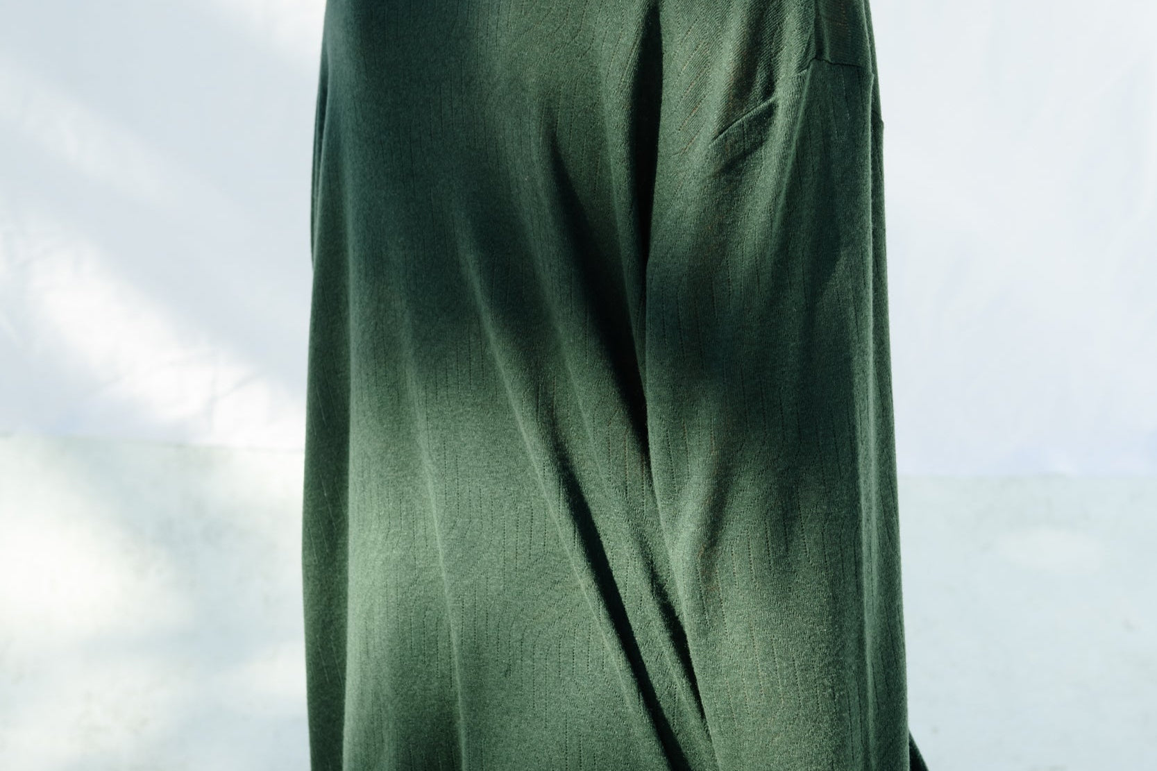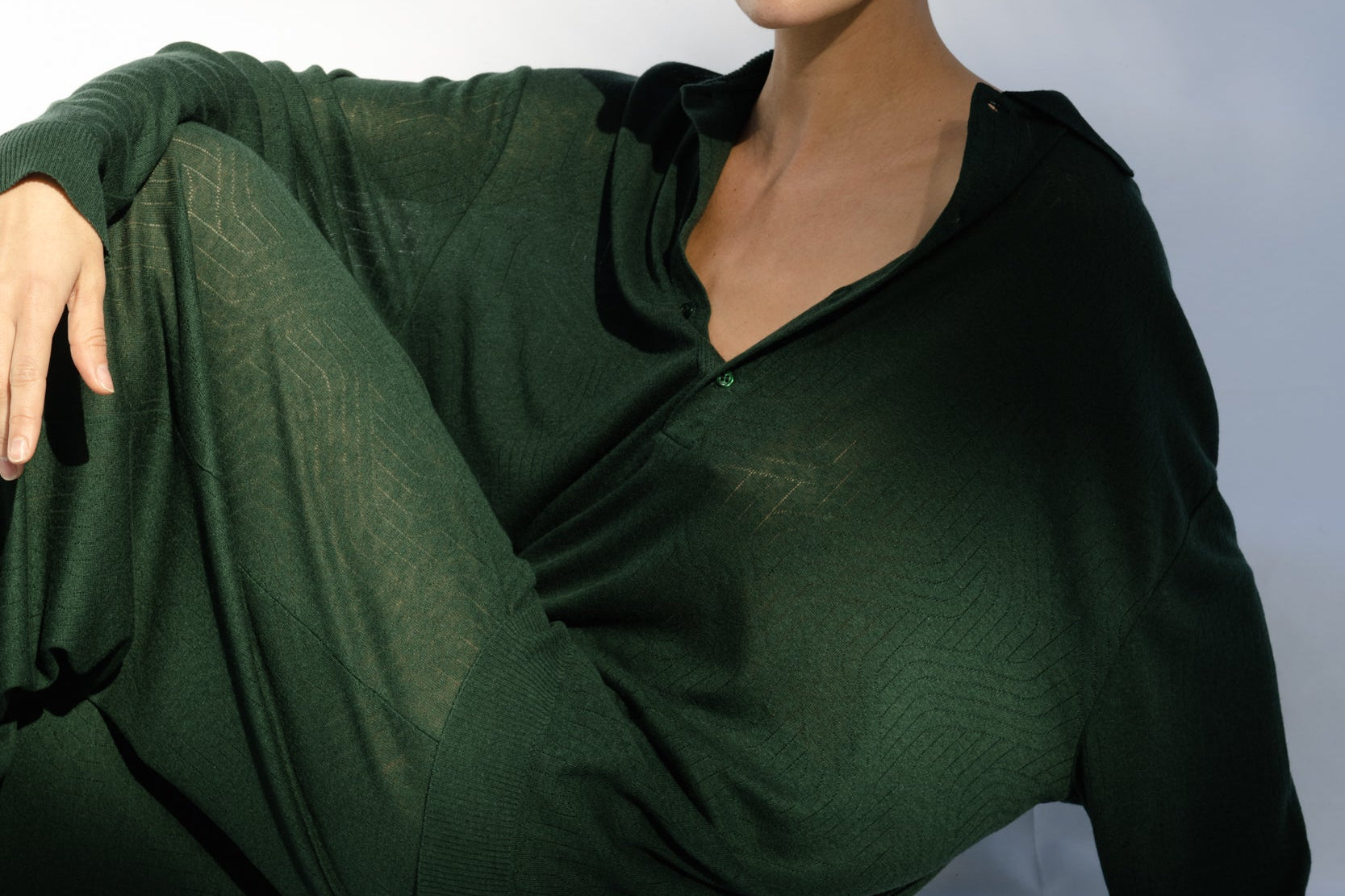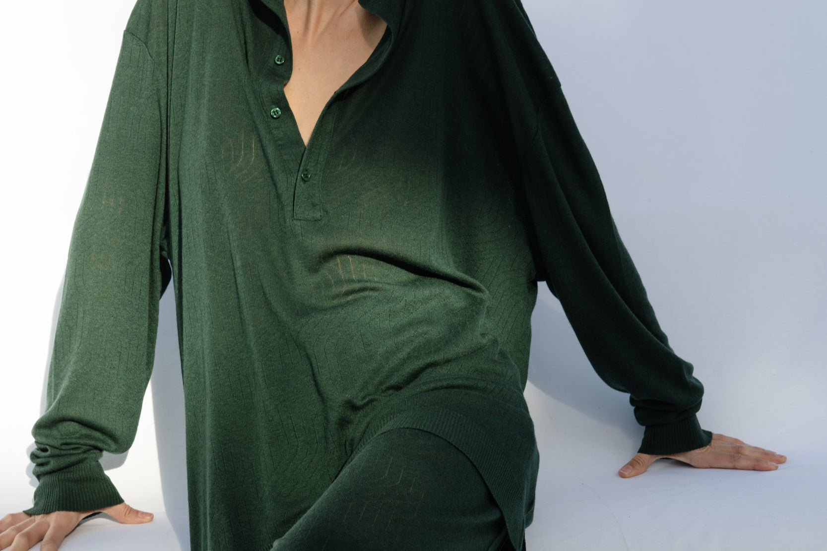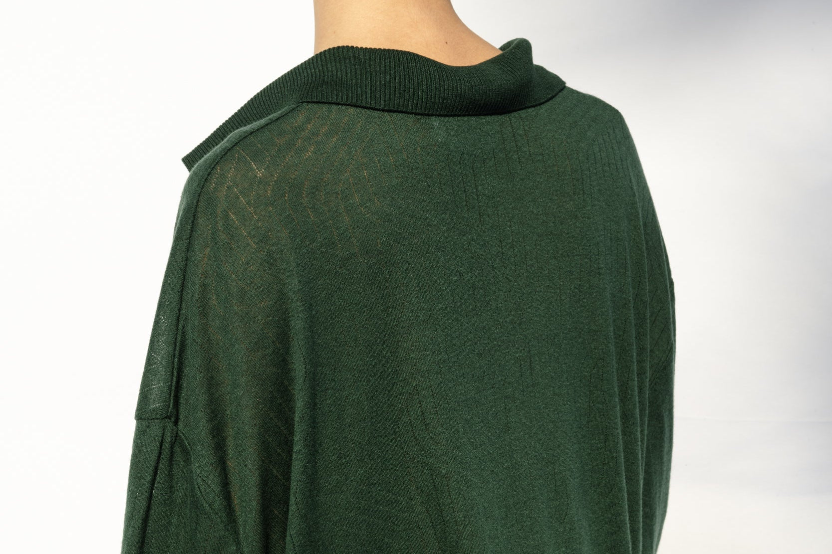 Unisex Polo Damon made from a light, warming Lyocell Wool blend. Unisex, relaxed fit. Dropped shoulders and a ribbed finish on the neckline and cuffs. Polo neckline and Mother of Pearl button closure OEKO-TEX certified. Elevated, comfortable design. Needle-out garment detail inspired by 70s textiles.